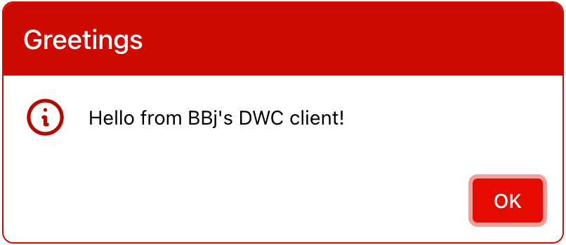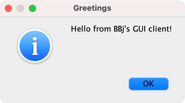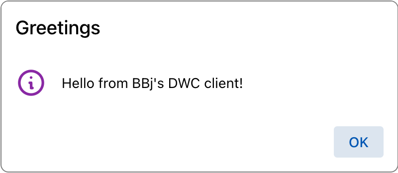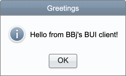 temp = msgbox("Hello from BBj's " + client$ + " client!", BBjSysGui.MSGBOX_ICON_INFORMATION, "Greetings", MODE="theme=primary")