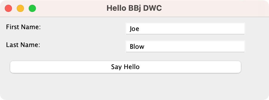 1) Begin by loading the GUISample.bbj program and running it in GUI, BUI, and the DWC. In at least one of the clients, fill in your first and last names in the BBjEditBoxes, then press the [Say Hello] button. The program will display a message box with a customized greeting using your full name.