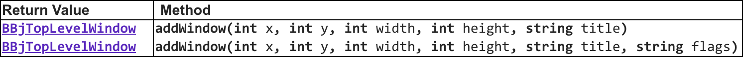 1) BBj programs running in GUI, BUI, and the DWC create their windows and controls by calling the appropriate add method on the BBjSysGui or BBjWindow objects. These add methods, such as the BBjSysGui::addWindow method shown below, take the window's or control's desired x, y, width, and height as parameters.