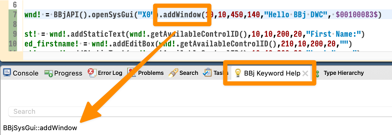 Begin by changing the code to specify the $00100083$ flags immediately following the window's title string in the line of code that instantiates the BBjTopLevelWindow. If you have installed the BBjUtils plug-in and have set the BBj Keyword Help view to be visible (Eclipse Preferences, Window > Show View > Other > BBj Keyword Help), you can click on the 'addWindow' method name as shown below and the plug-in will display the BBj Help link for the BBjSysGui::addWindow method. Double-clicking on the entry will display the associate help page in your browser so that you can decipher the flag values.