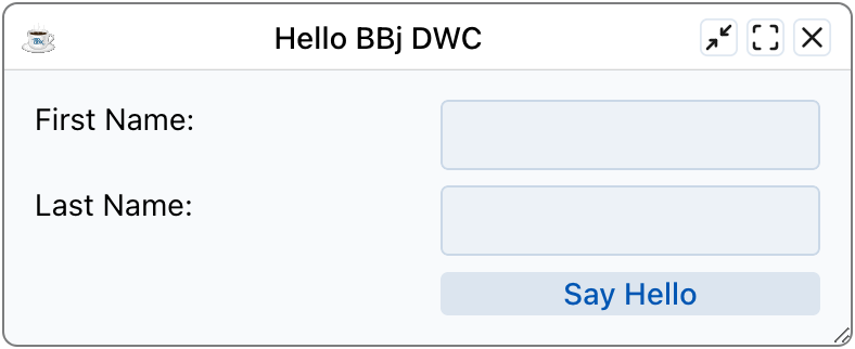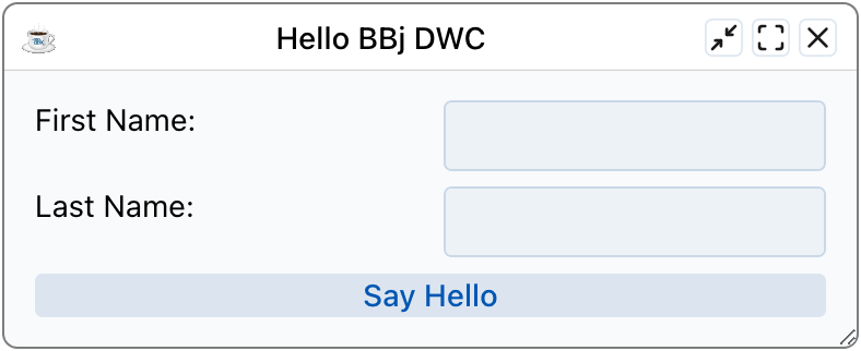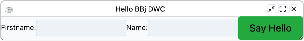The DWC1.bbj program sets the $00100000$ creation flag on the window to cause the DWC to ignore all size and position information for the controls added to the window. It then adds styles to the window's panel to layout the controls using CSS Grid. It also sets attributes on the [Say Hello] button so that it is displayed as a very large green button.