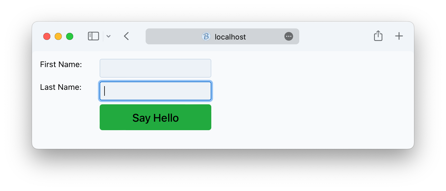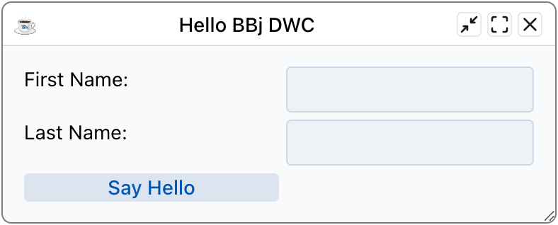 The program displays a dialog with inputs for the user's first and last names and a [Say Hello] button that greets the user by name when pressed. The GUISample.bbj program can run equally well in all three clients, but the exercises change the code to convert it to a DWC program that uses CSS Grid for layout.