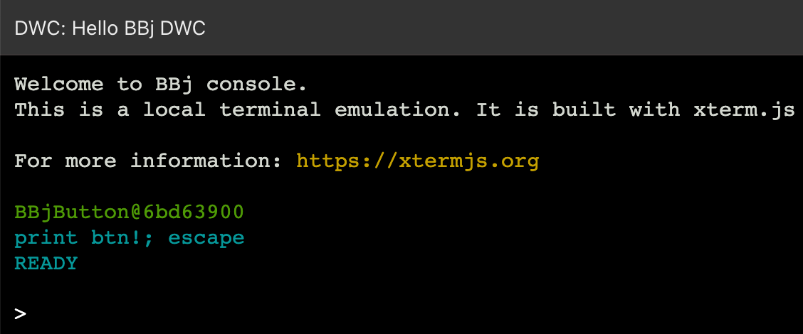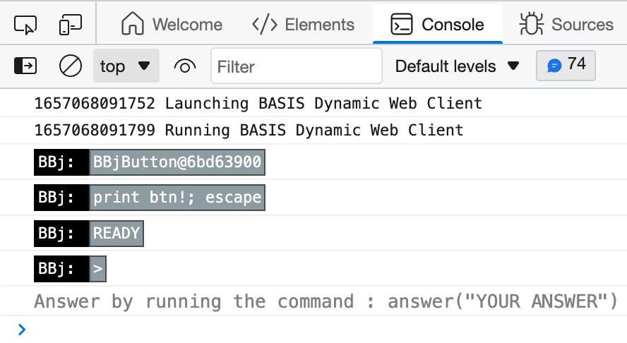 And run the program again in the DWC. Notice that the button information is displayed both in the BBj console and the Developer Tools' Console tab: