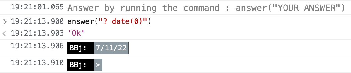 2) Try interacting with the BBj console by printing out the date (hint: ? date(0)).
