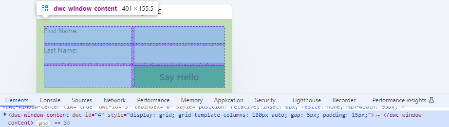 3) Clicking on the window's panel in the Elements tab when running the DWC1.bbj program overlays a grid on the app showing the padding (green), the CSS Grid's gap (purple), and the CSS Grid's cells (blue) that contain the BBj controls, as shown below. Note that the element has the following class names: dwc-window-container, dwc-window-center and dwc-window-content. The dwc-window-content class name corresponds to the BBj code that defines the CSS Grid by calling the setPanelStyle() method and providing the display property and grid value.