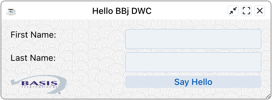 Once you have found the correct DIV element for the title bar, change the text from "Hello BBj DWC" to something else. This can be done by either: