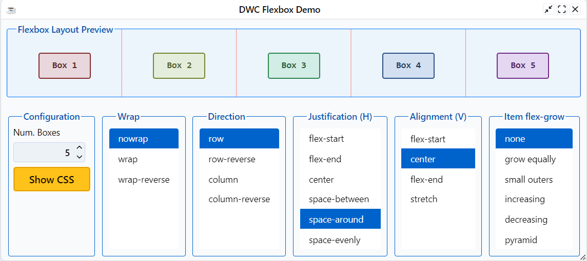 1) Start by running the DWCTraining/05_CssLayouts/DWCFlexbox.bbj program in the DWC. Experiment by selecting different flexbox settings and see how it affects the boxes in the blue window at the top. Also notice how the contents of the window change size and position when you resize the window. Here's an example of what the window looks like with changed parameters: