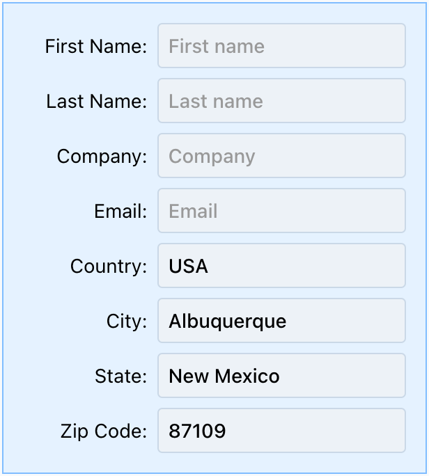 5) Layout 7 defines the grid's column template to "repeat(auto-fit, 100px 200px)", meaning that the first column (for the static text label) is 100 pixels and the edit box will be 200 pixels wide. But it uses the repeat() function with auto-fit, so now the number of columns increases based on the width of the window. When the window is narrow, the grid will have two columns (label and edit box). But as the form gets wider, more columns are added to fill the width. The screenshot below shows how the grid has four columns when the window is wide enough for two labels and two edit boxes: