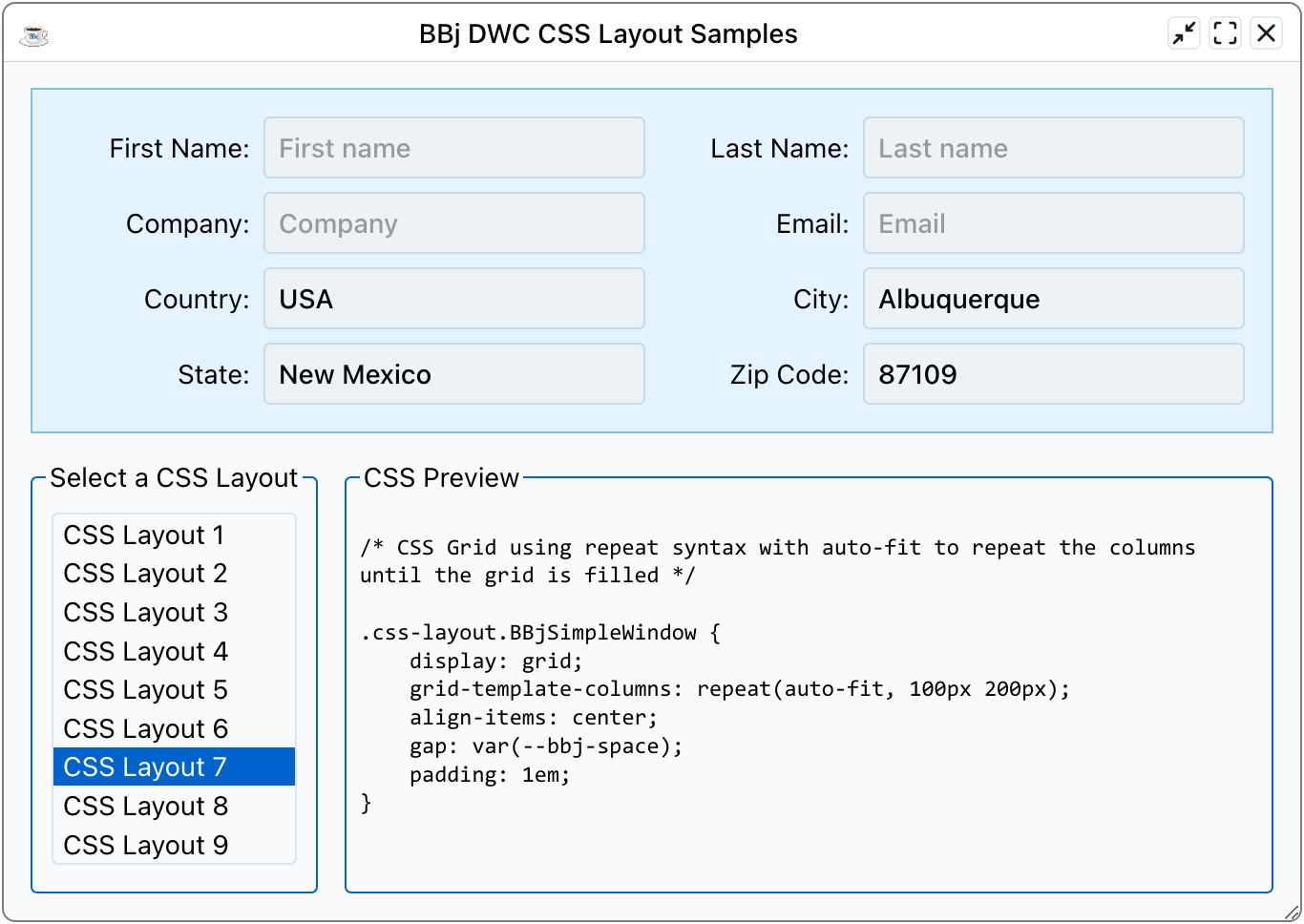 1) Start by running the DWCTraining/05_CssLayouts/DWCGrid.bbj program, then choose different layouts from the bottom-left list box and notice how it affects the form's layout at the top.2) Note that the layouts start out simple, where layouts 1 and 2 use "auto 1fr" and "1fr auto" to show how fractional units are treated differently than the "auto" unit. When using both together, the fractional unit "wins" by grabbing most of the available space.