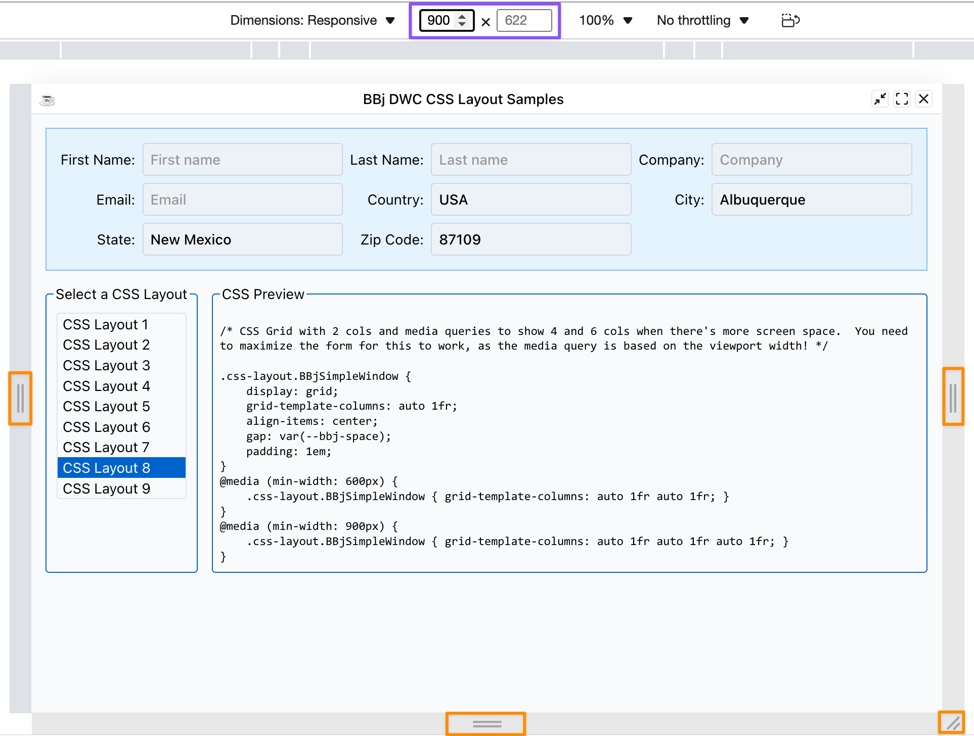 This section covers the different CSS layout strategies that we can employ to make a responsive BBj application running in the Dynamic Web Client. It's important to note that many projects end up using multiple layout strategies, as some are better suited to some tasks than others. A DWC app can easily mix and match CSS layout techniques and use a combination strategies to build a responsive app that changes to adapt to the client's display in the most effective manner.Concepts Covered in This Section