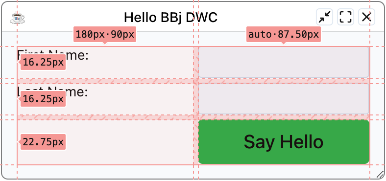 Recall the /DWCTraining/01_GUI2BUI2DWC/DWC1.bbj program from the first chapter, where we used this methodology with the CSS grid for layout using this code:
