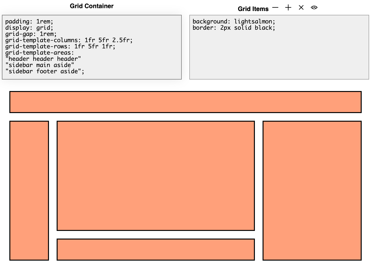 - Defining named areas in the grid, then setting CSS properties and values on the items to specify which area they will be placed in.