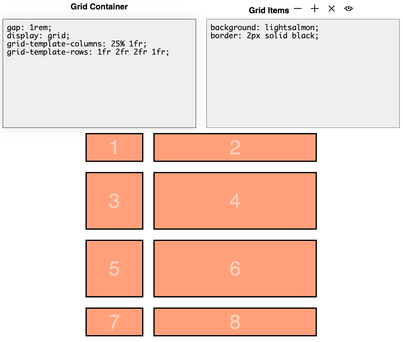 For many, this is the easiest way to work with the CSS Grid, as you merely define the rows and columns and the controls will be filled in automatically. Additionally, since we're not setting the starting/ending/span for each item in the grid, this method is much more succinct.